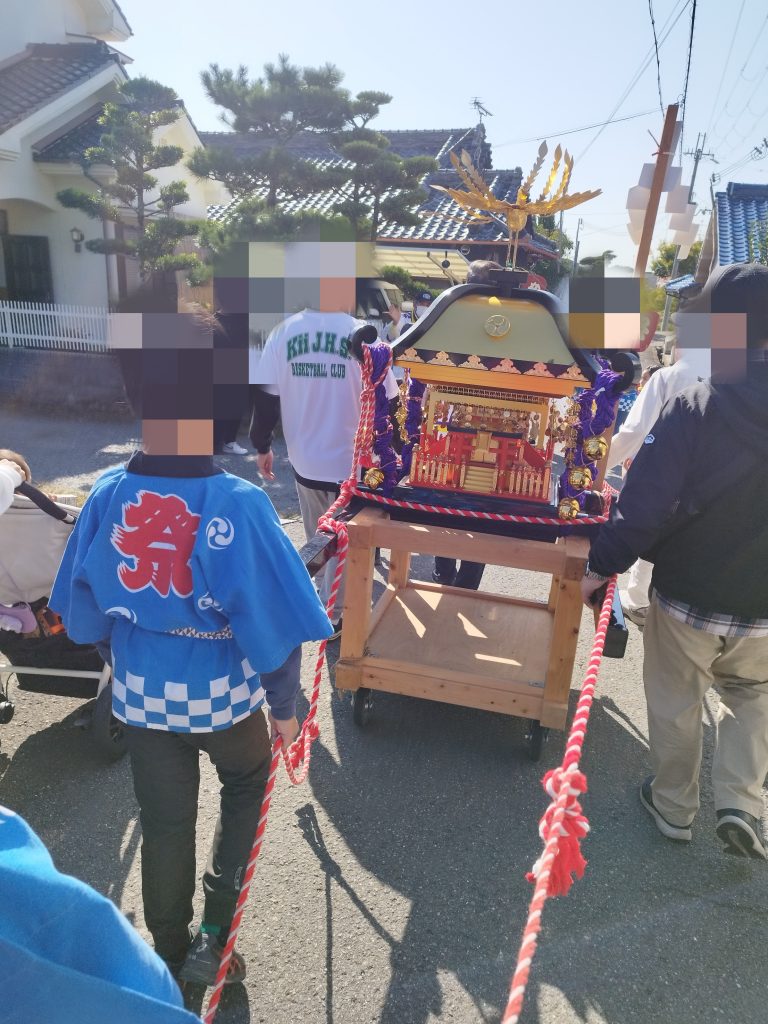 子供たちに交じって、私も一緒にひもを引き、ご寄付をしてくださった方の家の前で、神輿を3回担ぎ、無病息災を願う🙏
