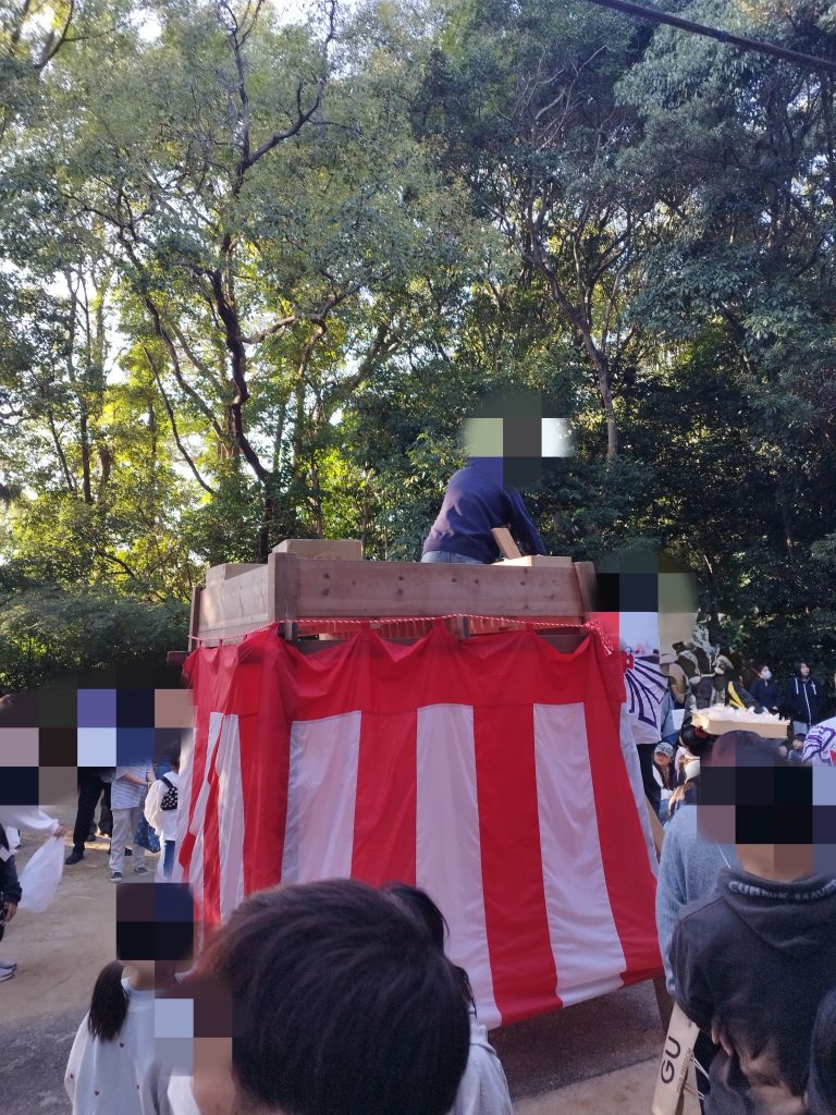 8日の朝、八幡さんにいつものようにウォーキングに出かけ、たまたま電話で宮司さんと話をした。“大中さん、今日は聖天宮さんから神輿出るで、昼からは餅投げもあるから是非”とお誘いいただいた。