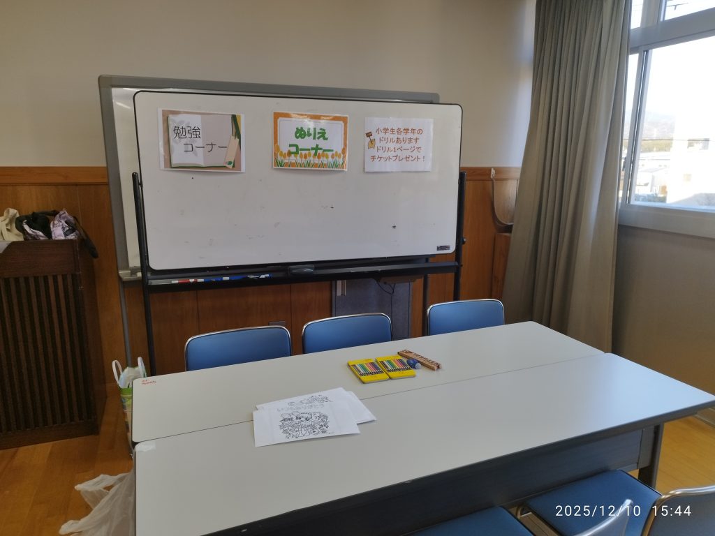 ボランティアは、今回もぬりえ、勉強ブースを担当。