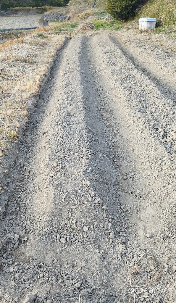 同志の畝は、几帳面な性格がめっちゃ出ています。耕運機も使い細かく土を砕いて畝たてをしています。私の畝とは大違いやな~🤭