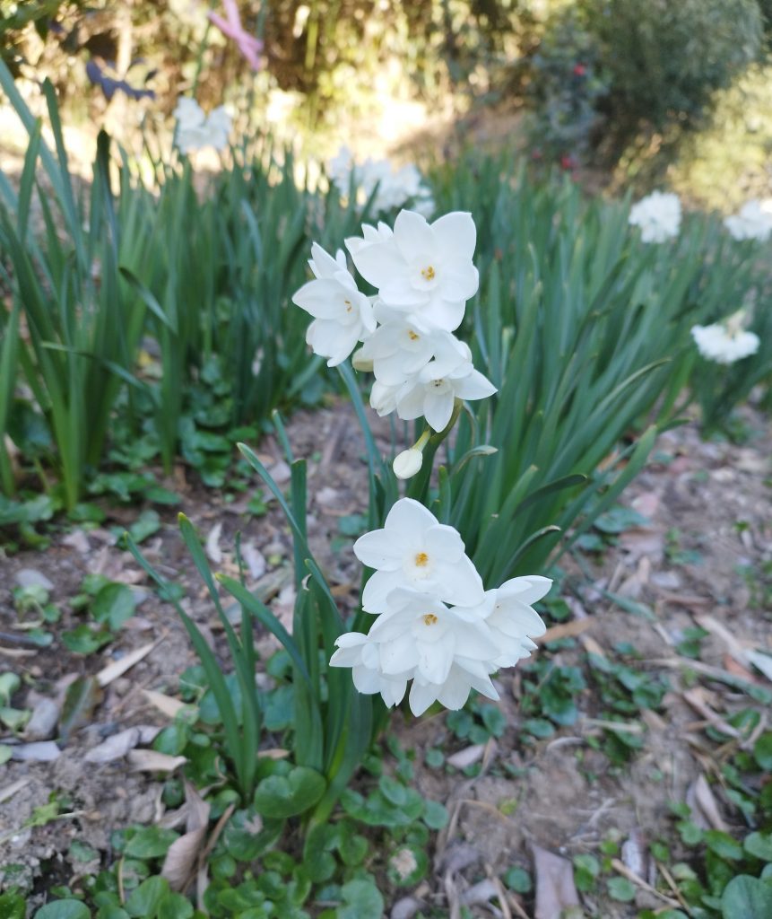 山のところに生えている黄色の水仙と共に。。。い叩いた白い水仙は墓には4本と家のお手元供養に1本お供えしました。母も喜んでいたと思います。母が生きていたら、水仙をいただいた女性の方と同じくらいでしょうか。。。いくつなのか、知らないけれど。。。