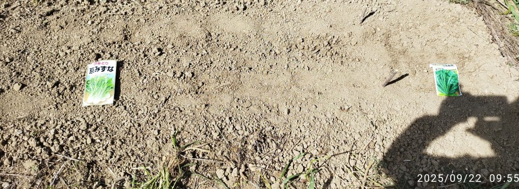 その後ネギの横に、畝の南から、去年ご近所のおばちゃんにもらった人参のタネ、真ん中にビタミン菜、北の端に私の自然栽培の人参のタネを蒔きました。