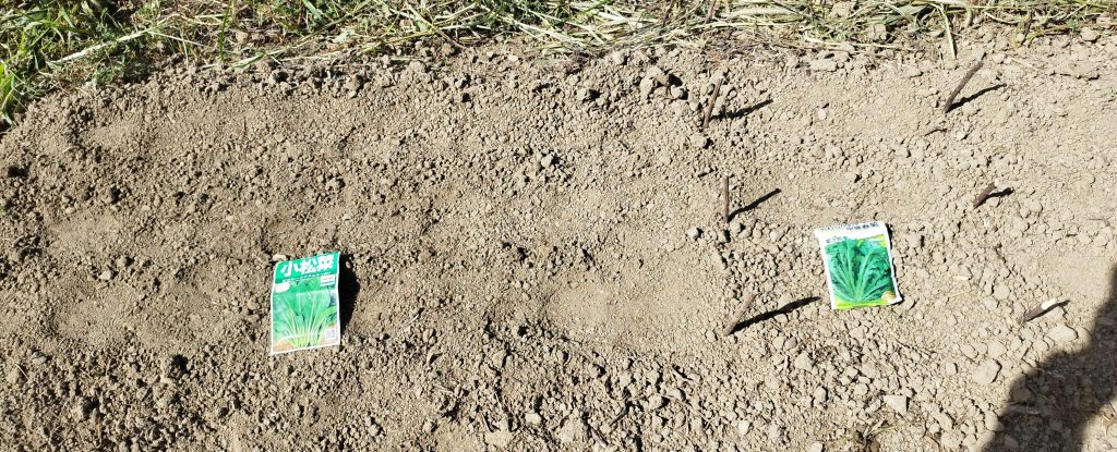 山の畑はすべて自然栽培の予定。1畝に、南から小松菜、春菊、水菜、春菊の順に蒔きました。春菊はコンパニオンプランツがわりに、間に少しづつ🌿